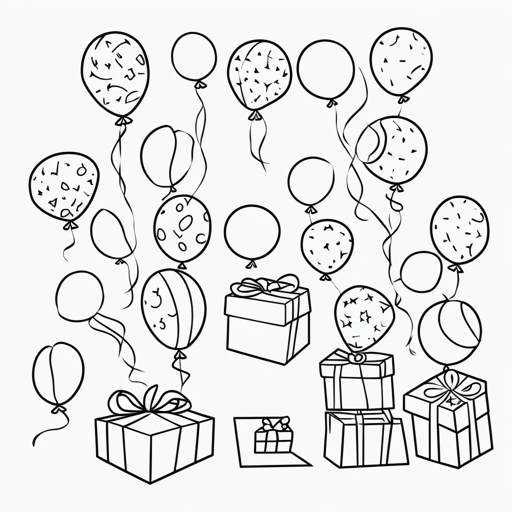 Explore the delightful simplicity of our black and white vector line art featuring wrapped gifts and balloons. Perfect for children's…