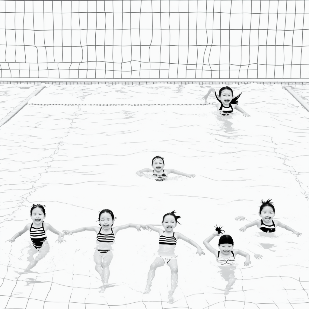 Simple Black and White Vector Line Art of Kids Swimming