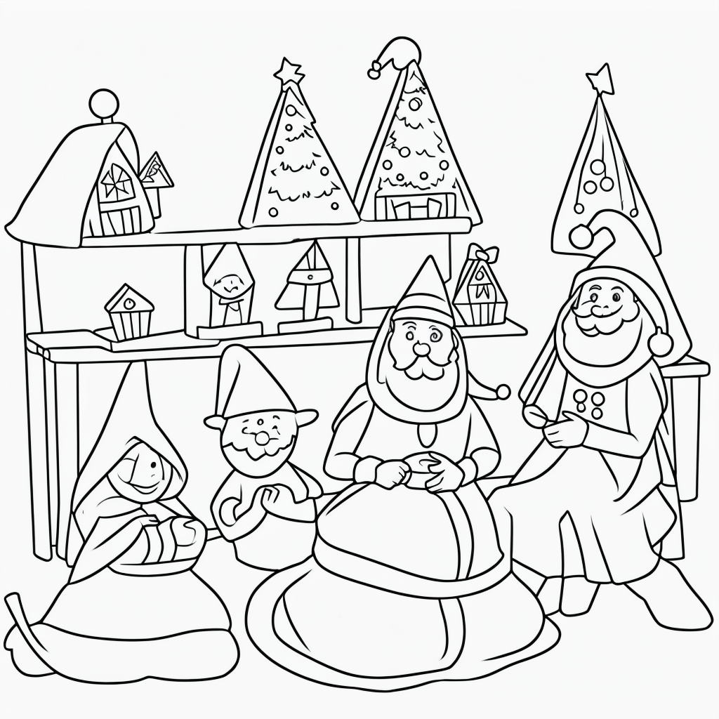 Dive into a magical world with our black and white coloring page featuring busy elves in Santa's workshop. Perfect for…