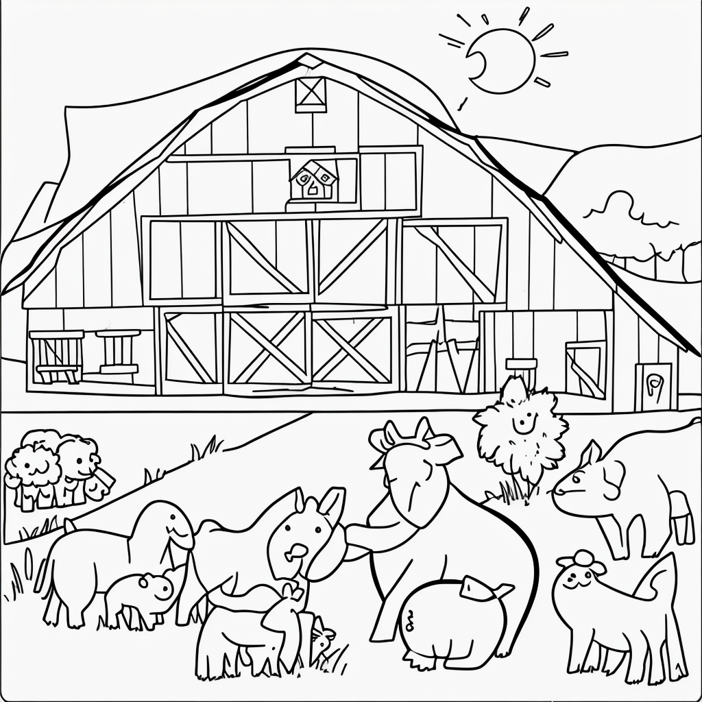 Discover a delightful black and white coloring page featuring a farm with adorable animals and a classic barn. Perfect for…