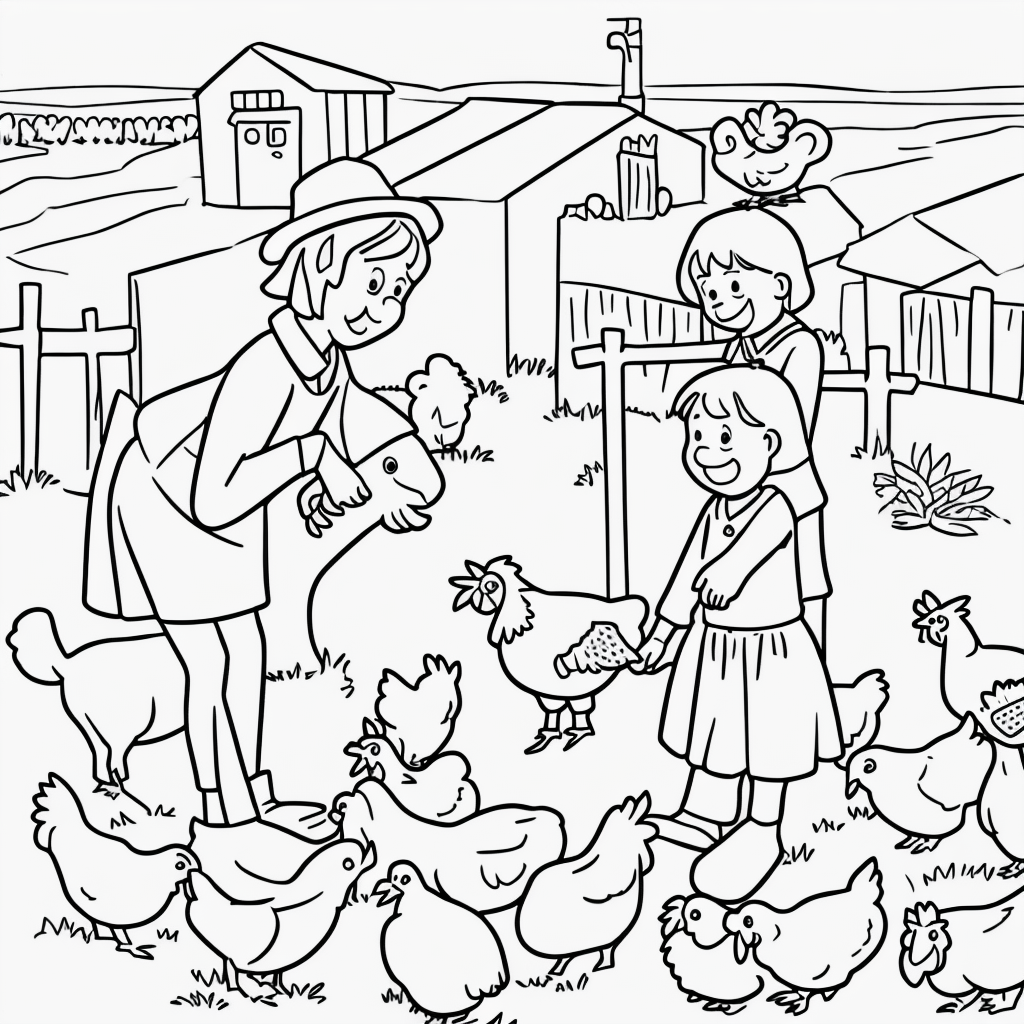 Discover a delightful and simple black and white coloring page for kids. Perfect for unleashing creativity, this farmer feeding chickens…
