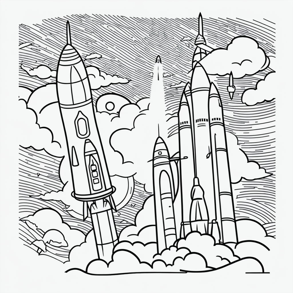 Discover the joy of creativity with our simple black and white vector line art of rocket ships. These bold, clean outlines are perfect for children's printable coloring pages. With minimal composition and contour drawing, kids will love launching their imagination into space. This flat white background art offers endless possibilities for coloring fun. Ideal for young artists and educators looking for engaging activities.