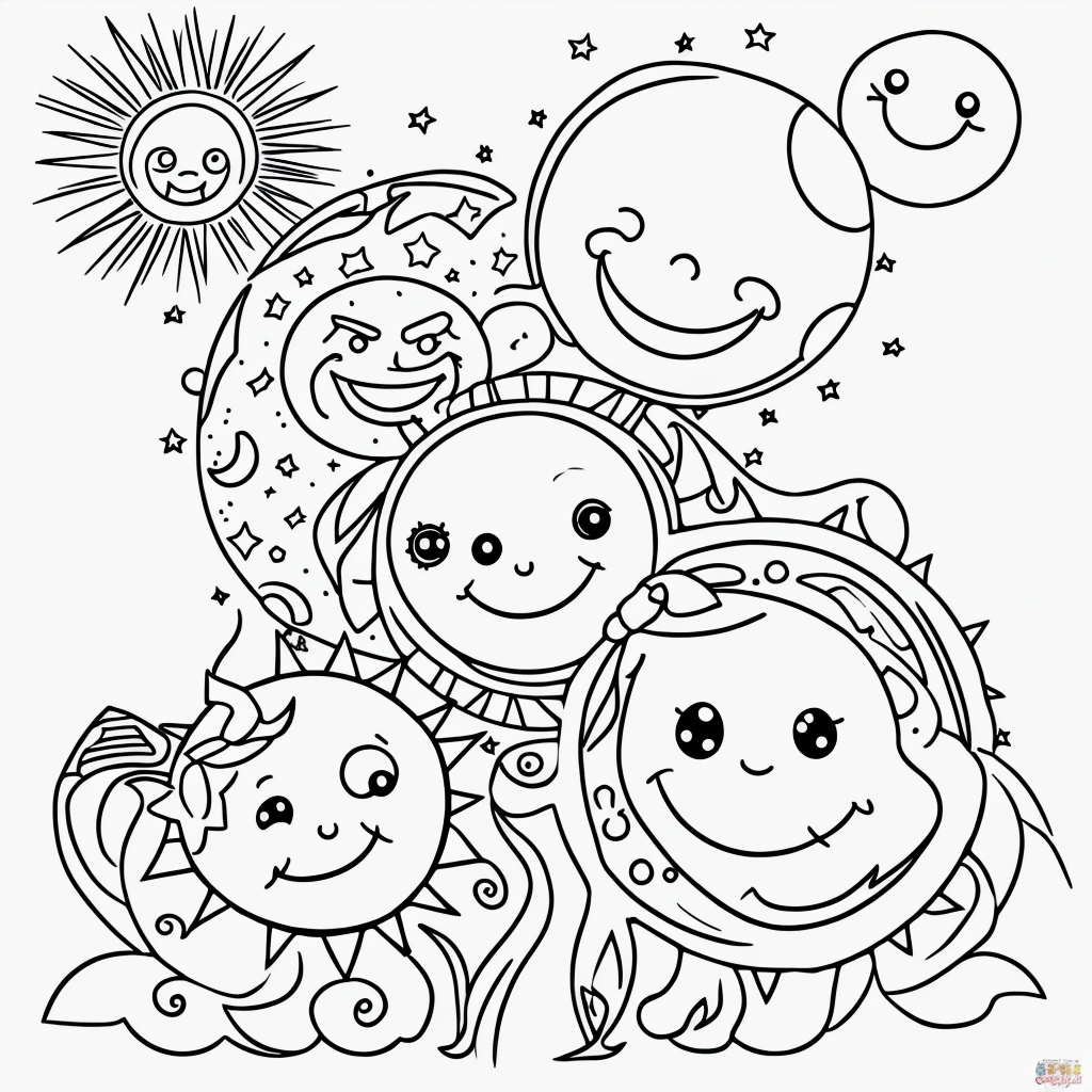 Explore our delightful collection of simple black and white coloring pages featuring planets and stars with friendly, smiling faces. Perfect for young artists seeking creative fun, these pages offer clear outlines and charming designs. Let your child's imagination soar while coloring these adorable celestial characters. Our pages are ideal for a relaxing, creative activity anytime. Download now and enjoy hours of entertainment!