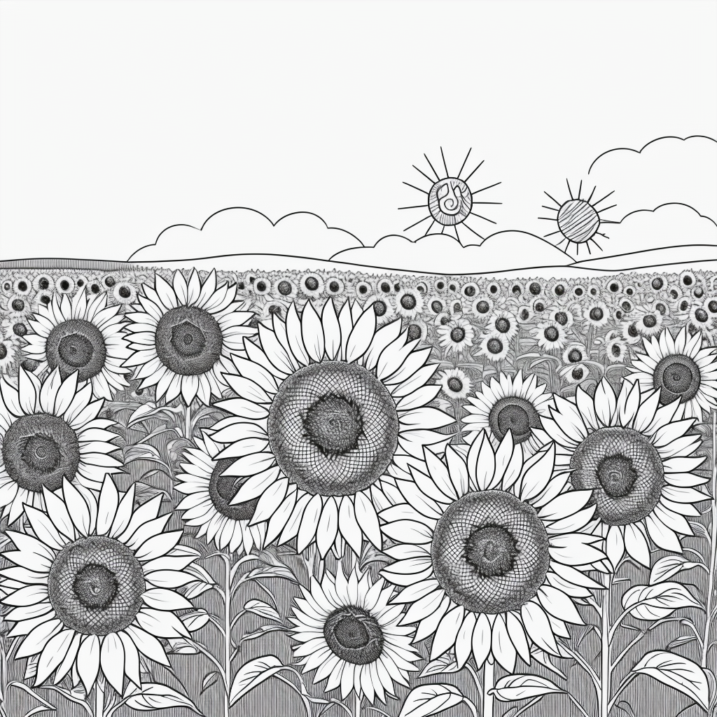 Explore the calming world of a black and white sunflower field, captured in this delightful line art style. With a…